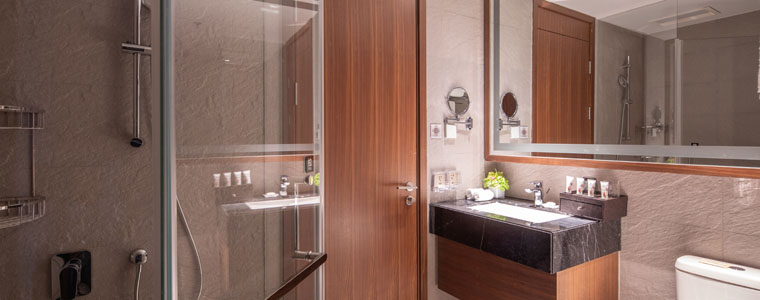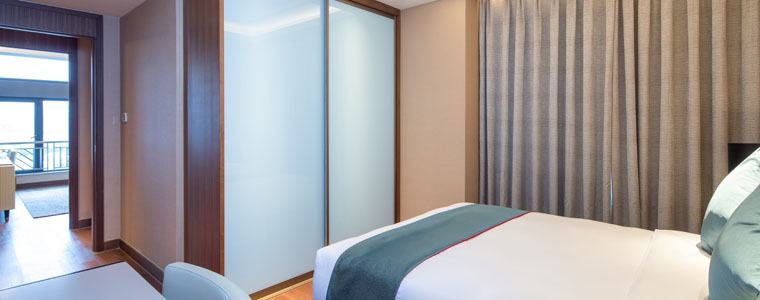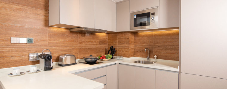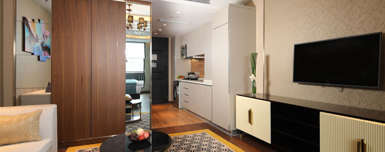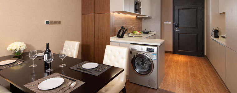 In the two-bedroom units, every gesture is tasteful: when serviced hotel guests return home, from the hotel-style lobby to the inside, they have a great environmental experience. Once inside, stock up on shoes and hats in the storage space, eat in the private dining area, review documents at the workbench in the master bedroom before bedtime, watch TV in the living room, or change clothes in the walk-in closet to get ready for bed. The master bedroom, walk-in closet, and bathroom are elegantly designed with the function and ambiance of a hotel-like presidential suite in mind. The spacious space in the cooking and dining area is reserved for the display of the usual appliances in the Western cooking area, such as the coffee machine and the micro-roaster, while also creating an emotional and interactive environment.